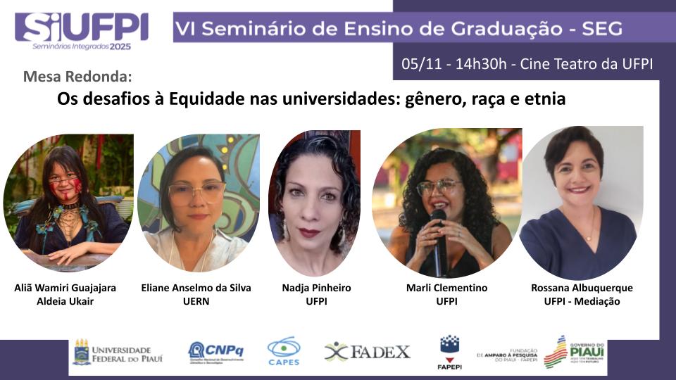 Mesa Redonda: Os desafios à Equidade nas universidades: gênero, raça e etnia Palestrantes: Profª. Drª. Eliane Anselmo da Silva – UERN Cacica Aliã Wamiri Guajajara - Aldeia Ukair Profª. Drª. Nadja Carolina de Sousa Pinheiro Caetano - UESPI Profª. Drª. Marli Clementino Gonçalves - UFPI MEDIADORA: Rossana Maria Marinho Albuquerque - UFPI A mesa redonda propõe o debate de ideias e discussão sobre os novos desafios enfrentados nas universidades públicas brasileiras; como garantir o acesso, a permanência das(os) estudantes negras(os) [pretas(os) e pardas(os)], indígenas, quilombolas, pessoas com deficiência e em situação de vulnerabilidade ao ensino superior, gratuito e de qualidade? Além disso, outras questões emergem como resultado de uma sociedade disfuncional/adoecida, tais como assédios e violências de todos os tipos que impactam diretamente na vida acadêmica da comunidade universitária. Ações institucionais vêm sendo promovidas com a formação de grupos/comitês de trabalho para criação e adoção de políticas e estratégias de enfrentamento ao assédio e violência, além da promoção de atividades lúdicas e recreativas para socialização e saúde física/mental. Isso basta? a resposta é um alto não. A partir das experiências das palestrantes convidadas, esperamos promover a autorreflexão das nossas ações (e microações) cotidianas e despertar a transformação no Ensino Superior. Currículo: Profª. Drª. Eliane Anselmo da Silva – UERN É graduada em Ciências Sociais pela UERN (2002), Mestre (2005) e Doutora (2011) em Antropologia pela Universidade Federal de Pernambuco - UFPE. Professora Adjunta do curso de Ciências Sociais da Universidade do Estado do Rio Grande do Norte - UERN. É Diretora da Diretoria de Ações Afirmativas e Diversidade - DIAAD/UERN. É professora permanente do POSENSINO (Programa de Pós-Graduação em Ensino - UERN/UFERSA/IFRN), onde foi vice coordenadora no período de 2019 a 2021; É professora permanente do ProfSocio (Mestrado Profissional em Sociologia); Foi Pró-Reitora Adjunta de Extensão - PROEX/UERN no período de 2021 a 2022. Coordena o Núcleo de Estudos Afro-Brasileiros e Indígenas (NEABI) da UERN. É líder do GRUESC (Grupo de Estudos Culturais), também da UERN. Foi Tutora do Programa de Educação Tutorial (PET) do curso de Ciências Sociais da UERN, do ano de 2019 ao ano de 2024. Presidiu a Comissão de Avaliação do Procedimento de Heteroidentificação para as Cotas Étnico-Raciais da UERN. É membro titular da UERN no Comitê Estadual Intersetorial de Atenção aos Refugiados, Apátridas e Migrantes do Rio Grande do Norte - CERAM/RN. Editora da RESC - Revista de Estudos SocioCulturais. Coordenou o curso de Ciências Sociais do PARFOR (Plano Nacional de Formação de Professores da Educação Básica), da UERN, Campus de Pau dos Ferros-RN. Tem experiência na área de Ensino, Pesquisa e Extensão, sendo seu campo específico a Antropologia, com ênfase em Estudos Religiosos, principalmente no campo Afro-brasileiro; Relações Étnico-Raciais; Cultura e Diversidade; Antropologia da Educação e Ensino de Antropologia; Refúgio e Migração, com ênfase nos Indígenas Warao. (Fonte: http://lattes.cnpq.br/8429272710753843) Cacica Aliã Wamiri Guajajara - Aldeia Ukair É indígena, educadora artística, curadora, artista, escritora, contadora de histórias e cacica, graduada em Licenciatura em Artes Visuais pela Universidade Federal do Piauí com pós-graduação em Educação Profissional pelo Instituto Federal do Piauí. É integrante da RNICAI- Rede Nacional e Internacional de Curadores e Artistas Indígenas. Diretora artística no empreendimento Oka Indígena. Cria projetos de Arte-Educação voltados à cultura indígena e geral, permitindo dialogar com a ancestralidade e contemporaneidade. Busca afirmar percursos de resistência étnica, interculturalidade e identidade, pretendendo diminuir os distanciamentos entre indígenas e não indígenas. (Fonte: https://site.veracruz.edu.br/vc_docente/alia-wamiri-guajajara/) Profª. Drª. Nadja Carolina de Sousa Pinheiro Caetano - UESPI PROFESSORA DO CURSO DE PSICOLOGIA DO CENTRO DE CIÊNCIAS DA SAÚDE DA UNIVERSIDADE ESTADUAL DO PIAUÍ CCS/UESPI. LÍDER DO GRUPO DE PESQUISA PSICOLOGIA E DESENVOLVIMENTO HUMANO - GP/PSIDIHN. MEMBRO DO GRUPO DE PESQUISA FORMAÇÃO DE RECURSOS HUMANOS E ENSINO DO INDIVÍDUO ESPECIAL - GP/FOREESP. DOUTORA E MESTRE EM EDUCACÃO ESPECIAL PELA UNIVERSIDADE FEDERAL DE SÃO CARLOS. ESPECIALISTA EM SAÚDE PÚBLICA PELA UNIVERSIDADE FEDERAL DO PIAUÍ. PSICÓLOGA PELA UNIVERSIDADE ESTADUAL DO PIAUÍ (LICENCIATURA E BACHARELADO). LICENCIANDA EM PEDAGOGIA PELA UNIBF. ANALISTA DO COMPORTAMENTO. DESENVOLVE PESQUISAS SOBRE DESENVOLVIMENTO HUMANO NAS LINHAS TÍPICO E ATÍPICO EM MÚLTIPLOS CONTEXTOS. DESENVOLVE PESQUISAS SOBRE EXPRESSOES ARTISTICAS E SEUS IMPACTOS PARA O DESENVOLVIMENTO HUMANO. (Fonte: http://lattes.cnpq.br/2830278033241388) Profª. Drª. Marli Clementino Gonçalves - UFPI É graduada em Pedagogia pela Universidade Federal do Piauí (2003), Especialista em Educação do Campo e Desenvolvimento pela Universidade de Brasília (2005) e Mestre e Doutora em Educação pela Universidade Federal do Piauí. Professora Efetiva na Graduação e Pós -Graduação em Educação, Associada I da Universidade Federal do Piauí na área de Fundamentos Políticos e Administrativos da Educação, integra o Núcleo de Estudos, Pesquisas e Extensão em em Educação do Campo - NUPECAMPO e o Núcleo de Pesquisas em Políticas e Gestão da Educação - NUPPEGE.Têm experiência em Educação, com ênfase em Política Educacional, Educação do Campo, Juventudes e Movimentos Sociais do Campo e Educação de Jovens e Adultos, estando atualmente na Coordenação Geral de Graduação/CGRAD PREG UFPI. (Fonte: http://lattes.cnpq.br/5870583160701292) Profª. Drª. Rossana Maria Marinho Albuquerque - UFPI: doutora em Sociologia (UFSCar), docente do d